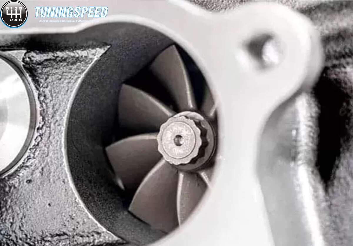 Paired with the compressor wheel is an MHI TF06 high-flow turbine wheel. This wheel uses a 9-blade design which reduces overall rotating mass and thus improves response and spool.